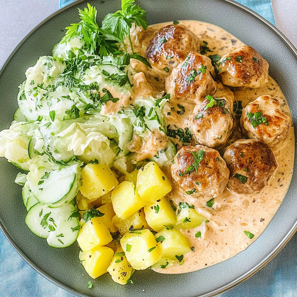 Du kannst dieses Rezept nach Belieben variieren! Für eine leckere Abwechslung kannst du das Rinderhackfleisch in den Fleischbällchen durch gemahlenes Hähnchen oder Pute ersetzen, was die Bällchen leichter und zarter macht. Füge zusätzlich etwas geriebenen Parmesan in den Kartoffelstampf hinzu, um eine cremigere Textur und einen herzhaften Geschmack zu erzielen. Und um dem Gurkensalat eine frische Note zu verleihen, könntest du einige Kirschtomaten hinzufügen – das sorgt nicht nur für Farbe, sondern auch für eine süßliche Frische, die perfekt harmoniert!