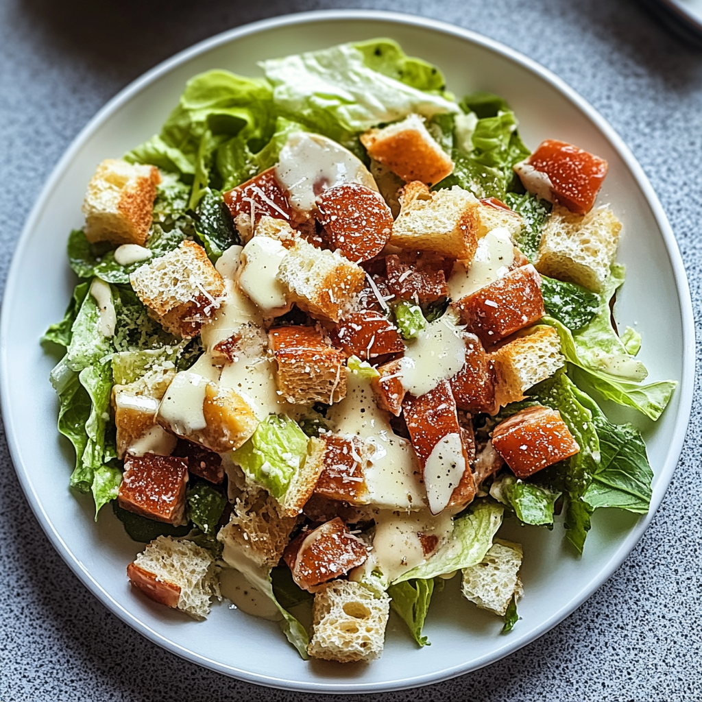 Wenn du auf der Suche nach einem erfrischenden und zugleich herzhaften Salat bist, der deinem Gaumen schmeichelt, dann ist dieser Frisch & Knackig Caesar Salad genau das Richtige für dich! Die Kombination aus knackigem Römersalat, einer cremigen Dressing und frisch geriebenem Parmesan macht diesen Salat zu einem absoluten Genuss. Egal ob als Beilage oder Hauptgericht, dieser Salat wird schnell zum Star auf deinem Tisch.